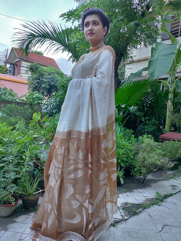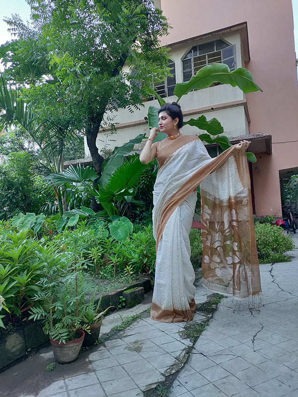 This piece of cloth has white shibori all over with border lines having the chestnut color. The pallu has a beautiful floral pattern which will make you look beautiful and you will feel the comfort of the muslin silk saree. You get slit kuchu ends in white which is an exact contrast to the saree.