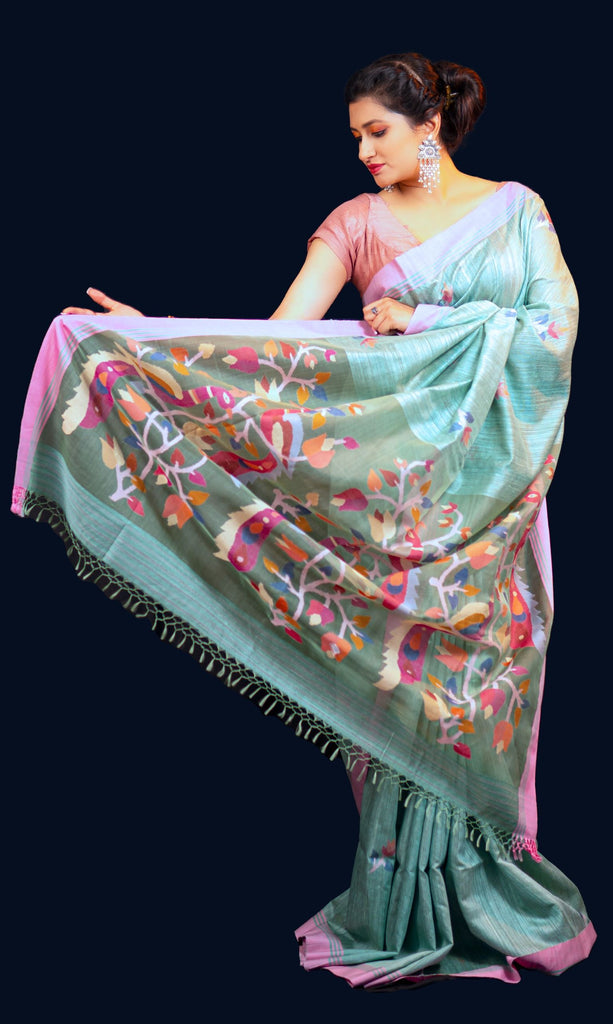 The words "Jam" (meaning flower) and "Dani" (meaning vase) came together to form the name Jamdani, popular with every saree lover. The name alludes to the magnificent flower arrangements that embellish these stunning sarees. Around this time, cotton, cotton silk, and pure mulberry silk were among the materials used in Matka Jamdani's handwoven sarees. The Jamdani weave is a type of "extra-weft" weaving that was first produced from Karpas cotton cultivated in the Brahmaputra hinterland. In addition to the regular weft that binds the warp threads together, each unique motif is made by weaving additional or different weft threads into the warp. The procedure involves a lot of time, energy, and expertise. Jamdani is woven using tiny looms threaded with colourful gold, or silver threads, much like tapestry art.