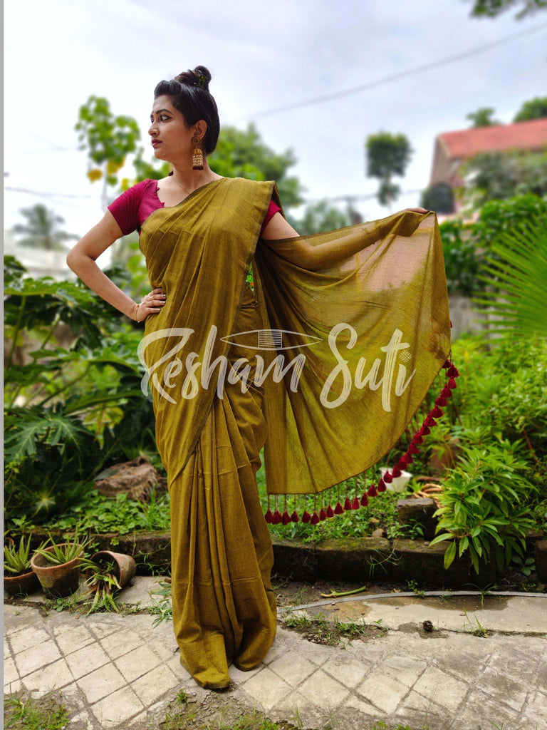 If you have a strong desire for sarees then this Handloom Resham Cotton saree will surely draw your attention. If you want to look gorgeous and unique on an occasion then you can easily go for this particular cloth. By draping this saree properly with multiple pleats, you can be the cynosure of a party. This particular saree comes in golden and yellow colours. This saree is decorated with various floral motifs and invigorative designs throughout the whole body including pallu.