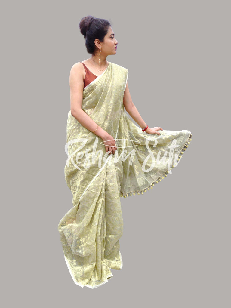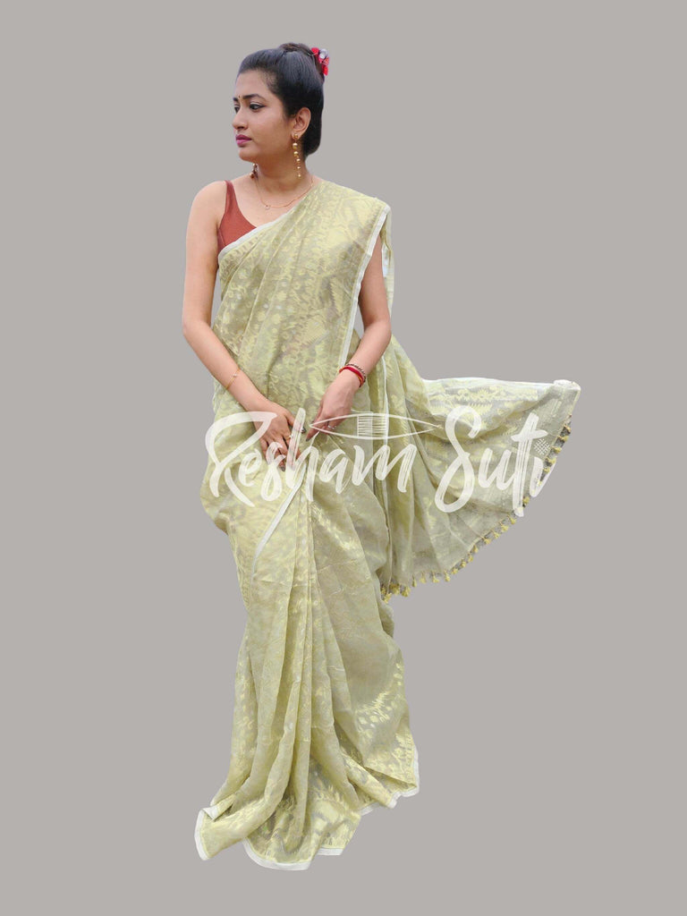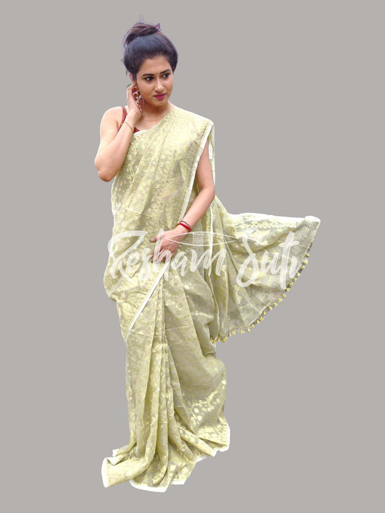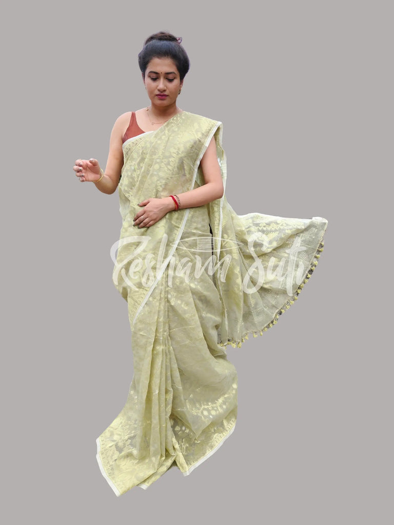 These Resham cotton jamdanis are almost always semi-translucent with a touch of the traditional to the modern arrangement of motifs on the pallu. The delicate patterns all over the subtly coloured undertone enhances the patterns even more. The floral combinations or even caricatures of leaflets or floral buds add a surreal beauty to the otherwise fine-textured fabric, perfect for your minimalistic look. Owing to its authentic identity, the selvage may appear as asymmetrical.