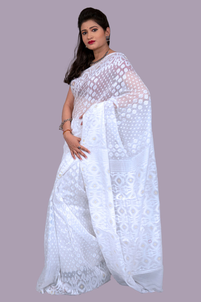 The model is of height 170 cm (5'57'') and is wearing a beautiful Resham Cotton Jamdani of 5.5 mtr.