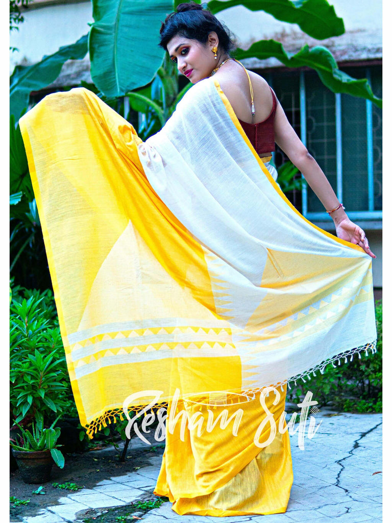 The saree made of cotton is woven by the weavers using either a shuttle loom or a throw loom. The incorporation of temple designs as borders contributes to its magnificent appearance.